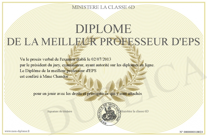 Envoyez par email votre Diplôme de la meilleur professeur d'EPS personalisé