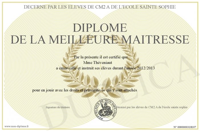 Envoyez par email votre Diplome de la meilleure Maitresse personalisé