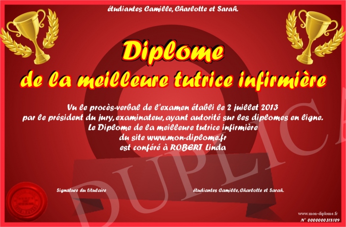 Envoyez par email votre Diplôme de la meilleure tutrice infirmière personalisé