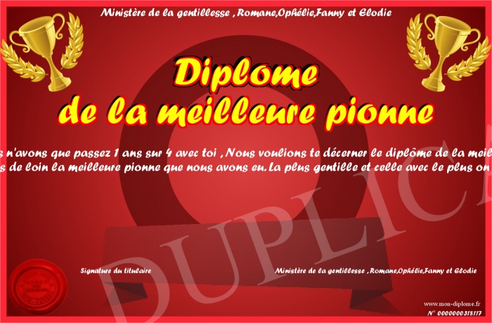 Envoyez par email votre Diplôme de la meilleure pionne personalisé