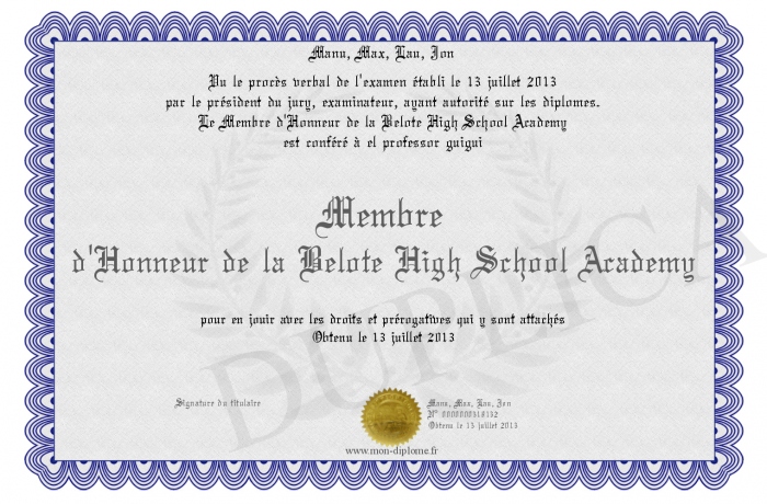 Envoyez par email votre Membre d'Honneur de la Belote High School Academy personalisé