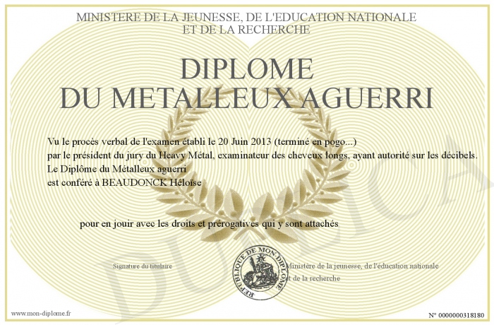 Envoyez par email votre Diplôme du Métalleux aguerri personalisé