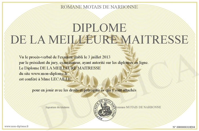 Envoyez par email votre Diplôme DE LA MEILLEURE MAITRESSE personalisé