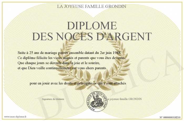 Envoyez par email votre Diplôme des Noces d'Argent personalisé