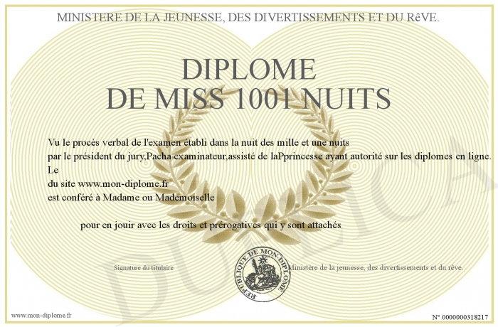 Envoyez par email votre Diplôme de MISS 1001 NUITS personalisé