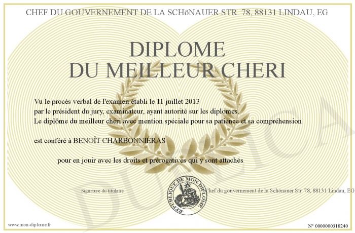 Envoyez par email votre Diplôme du meilleur chéri personalisé