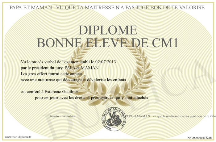 envoyé par le PAPA et MAMAN vu que ta maitresse n'a pas jugé bon de te valorisé !