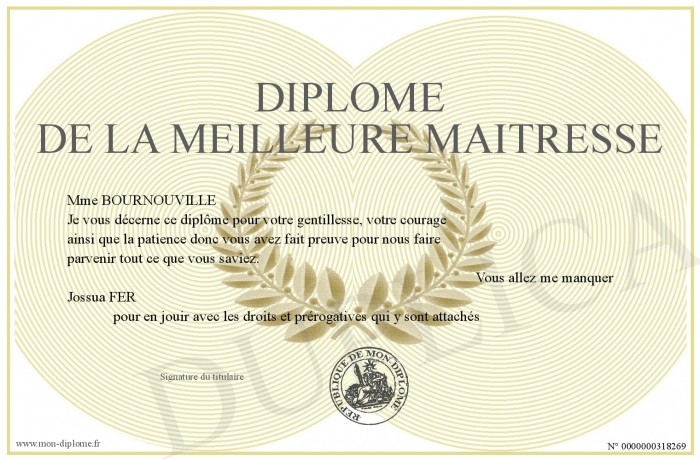 Envoyez par email votre Diplôme de la meilleure Maitresse personalisé