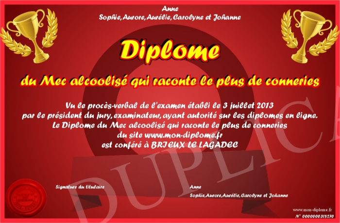 Envoyez par email votre Diplôme du Mec alcoolisé qui raconte le plus de conneries personalisé
