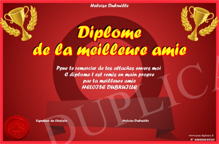 Envoyez par email votre Diplôme de la meilleure amie personalisé