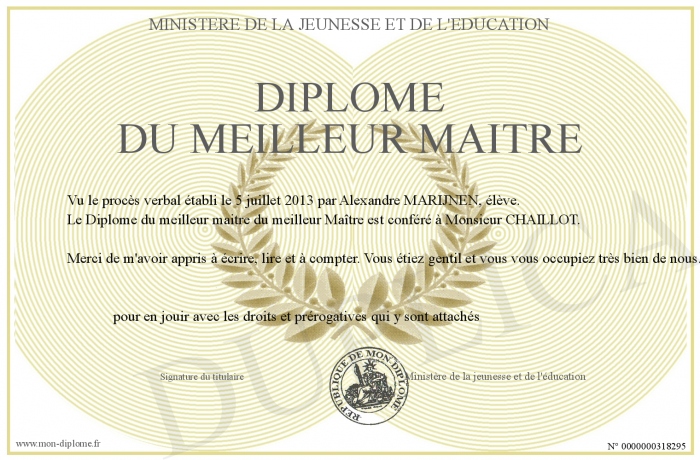 Envoyez par email votre Diplôme du meilleur maitre personalisé