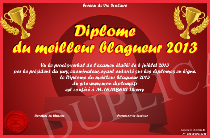 Envoyez par email votre Diplôme du meilleur blagueur 2013 personalisé