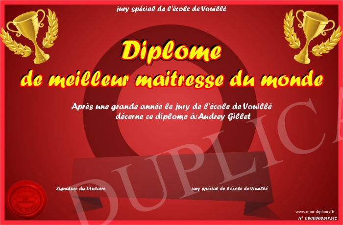 Envoyez par email votre Diplôme de meilleur maitresse du monde personalisé