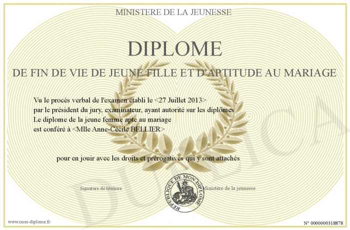 Envoyez par email votre Diplôme de fin de vie de jeune fille et d'aptitude au mariage personalisé