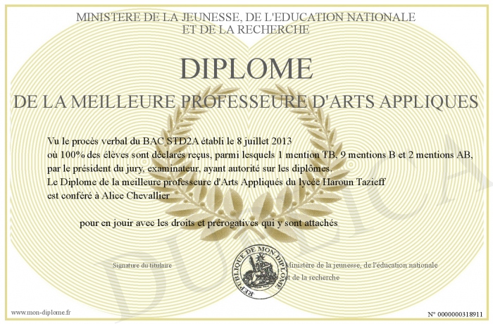 Envoyez par email votre Diplôme de la meilleure professeure d'Arts Appliqués personalisé