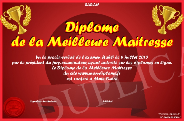 Envoyez par email votre Diplôme de la Meilleure Maitresse personalisé