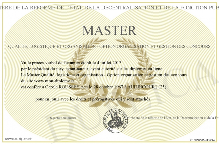 Envoyez par email votre Master Qualité, logistique et organisation - Option organisation et gestion des concours personalisé