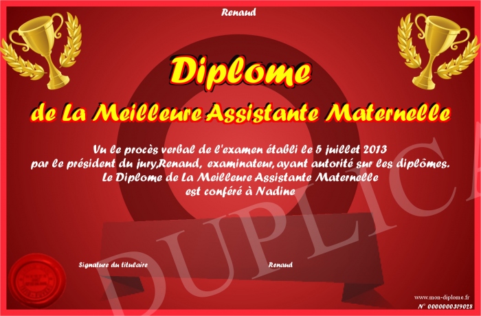 Envoyez par email votre Diplôme de La Meilleure Assistante Maternelle personalisé
