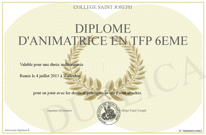 Envoyez par email votre Diplôme d'Animatrice en TFP 6ème personalisé