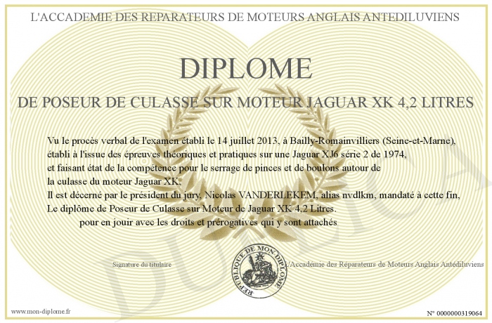Envoyez par email votre Diplôme de poseur de culasse sur moteur Jaguar XK 4,2 Litres personalisé