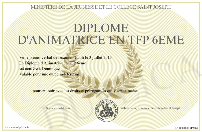 Envoyez par email votre Diplôme d'Animatrice en TFP 6ème personalisé