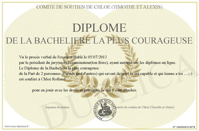 Envoyez par email votre Diplôme de la Bachelière la plus courageuse personalisé