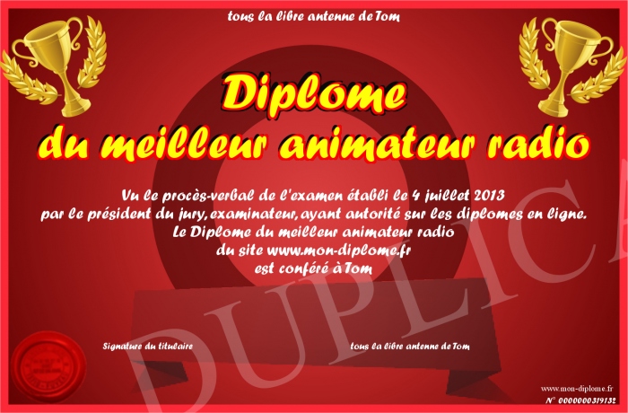 Envoyez par email votre Diplôme du meilleur animateur radio personalisé