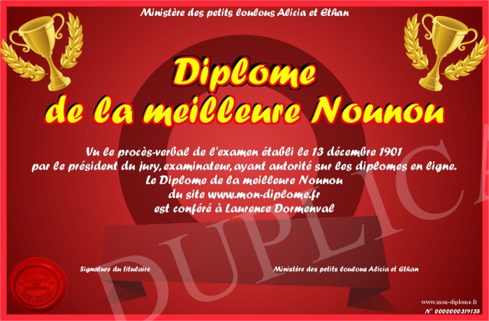Envoyez par email votre Diplome de la meilleure Nounou personalisé