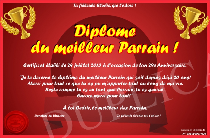 Envoyez par email votre Diplôme du meilleur Parrain ! personalisé