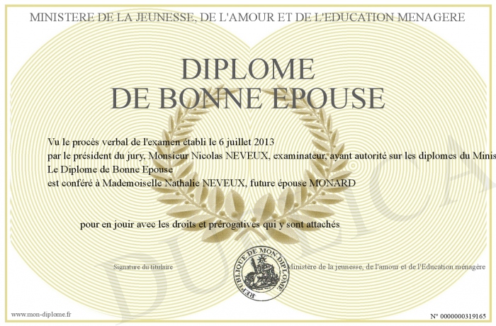 Envoyez par email votre Diplôme de Bonne Epouse personalisé