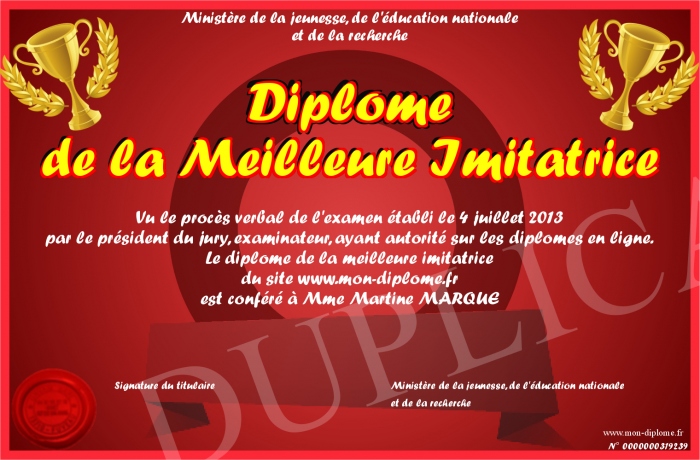 Envoyez par email votre Diplôme de la Meilleure Imitatrice personalisé