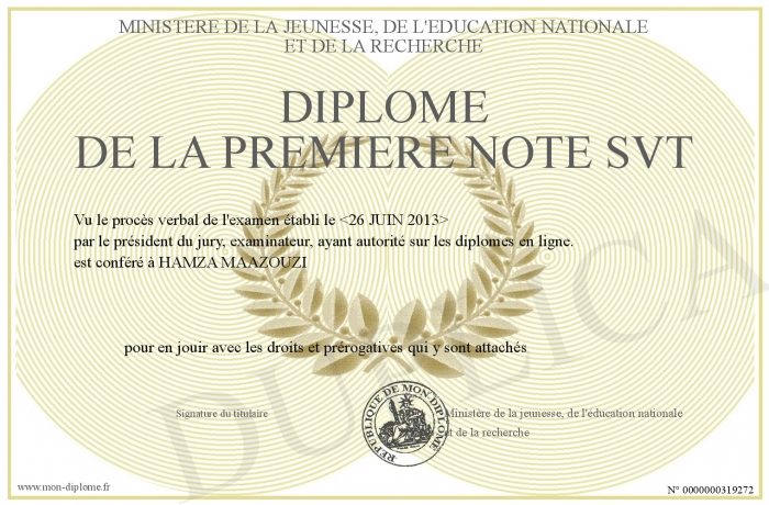 Envoyez par email votre Diplôme De La Premiére Note SVT personalisé