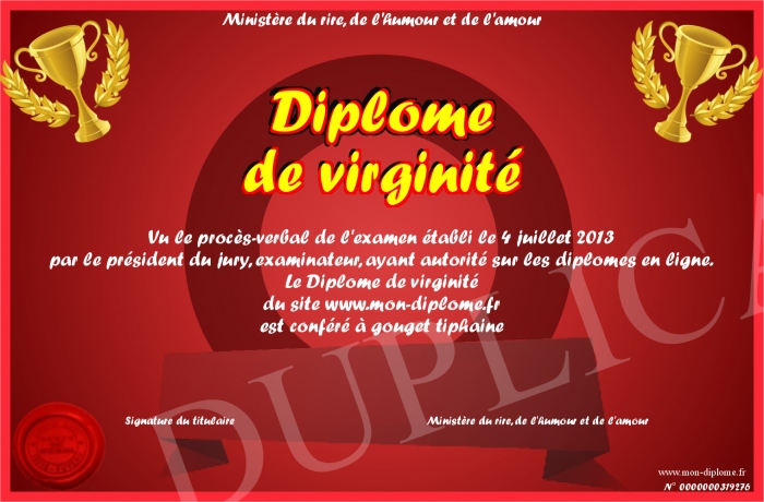 Envoyez par email votre Diplome de virginité personalisé