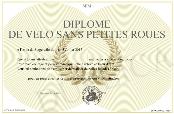Envoyez par email votre Diplome de Vélo sans petites roues personalisé