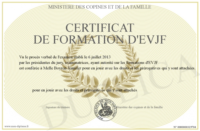 Envoyez par email votre Certificat de formation d'EVJF personalisé