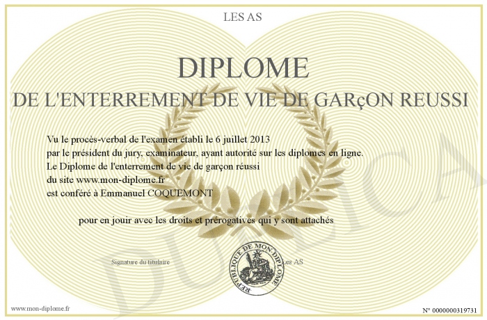 Envoyez par email votre Diplôme de l'enterrement de vie de garçon réussi personalisé