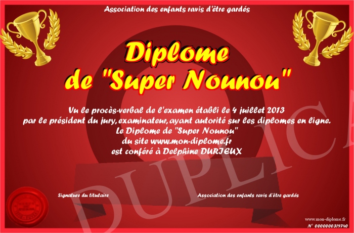 Envoyez par email votre Diplôme de -Super Nounou- personalisé