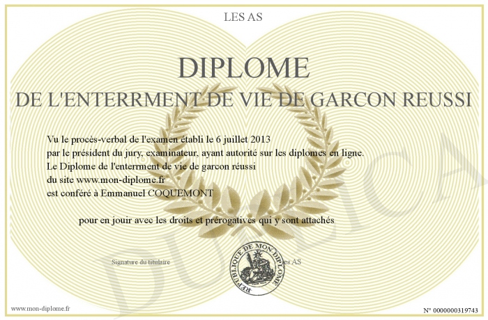 Envoyez par email votre Diplôme de l'enterrment de vie de garcon réussi personalisé