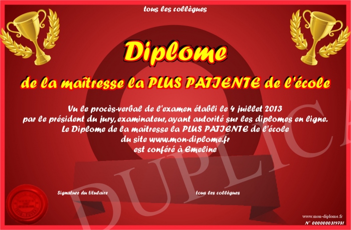 Envoyez par email votre Diplôme de la maîtresse la PLUS PATIENTE de l'école personalisé