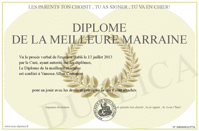 Envoyez par email votre Diplôme de la meilleure marraine personalisé