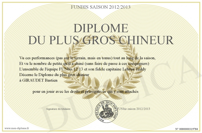 Envoyez par email votre Diplôme du plus gros chineur personalisé