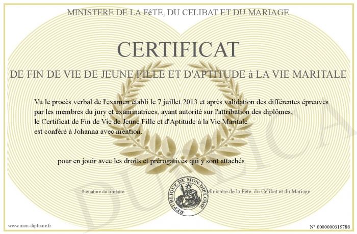 Envoyez par email votre Certificat de Fin de Vie de Jeune Fille et d'Aptitude à la Vie Maritale personalisé