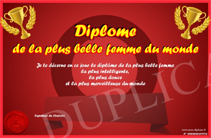 Envoyez par email votre Diplôme de la plus belle femme du monde personalisé