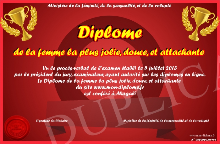 Envoyez par email votre Diplôme de la femme la plus jolie, douce, et attachante personalisé