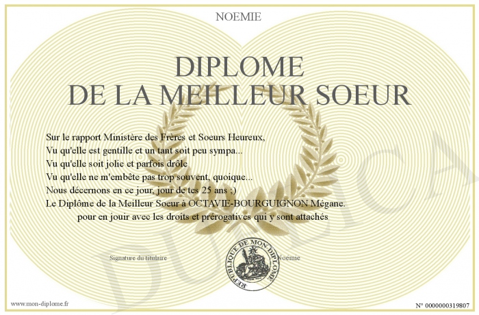 Envoyez par email votre Diplôme de la Meilleur Soeur personalisé