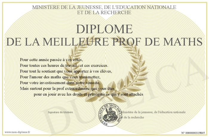 Envoyez par email votre Diplôme de la meilleure prof de maths personalisé