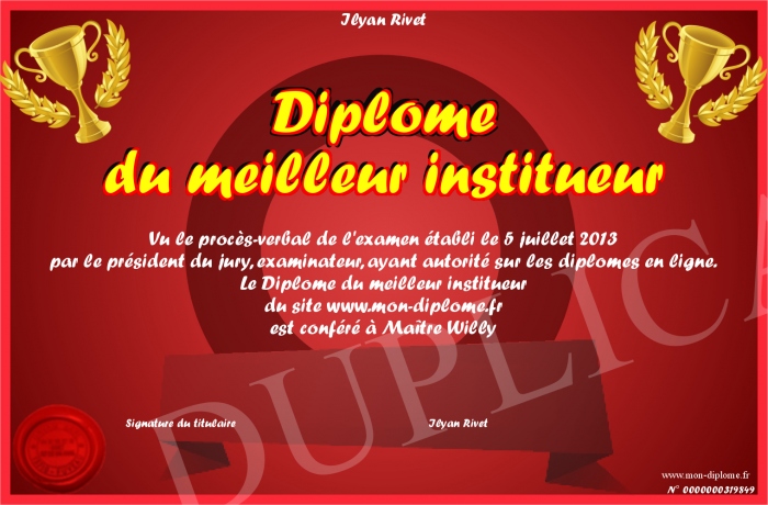 Envoyez par email votre Diplôme du meilleur institueur personalisé