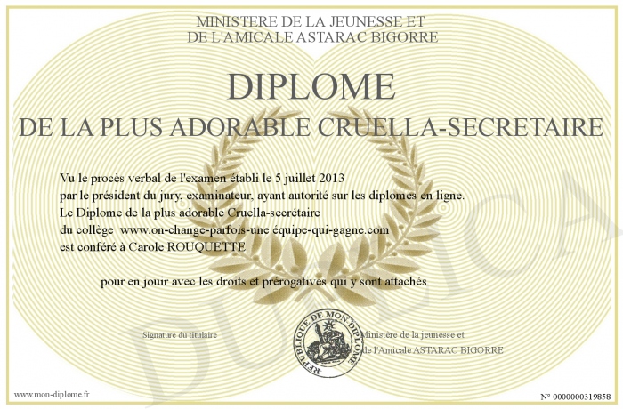 Envoyez par email votre Diplôme de la plus adorable Cruella-secrétaire personalisé