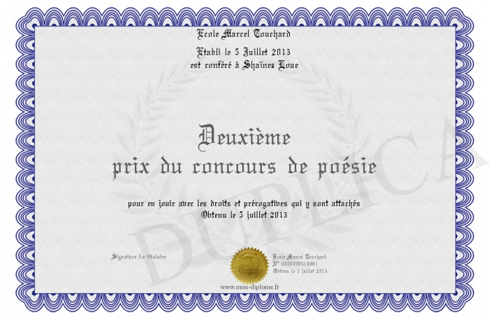 Envoyez par email votre Deuxième prix du concours de poésie personalisé