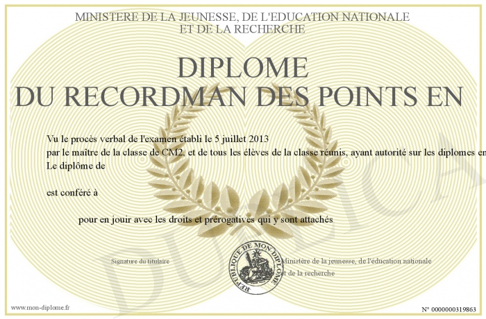 Envoyez par email votre Diplôme du recordman des points en personalisé